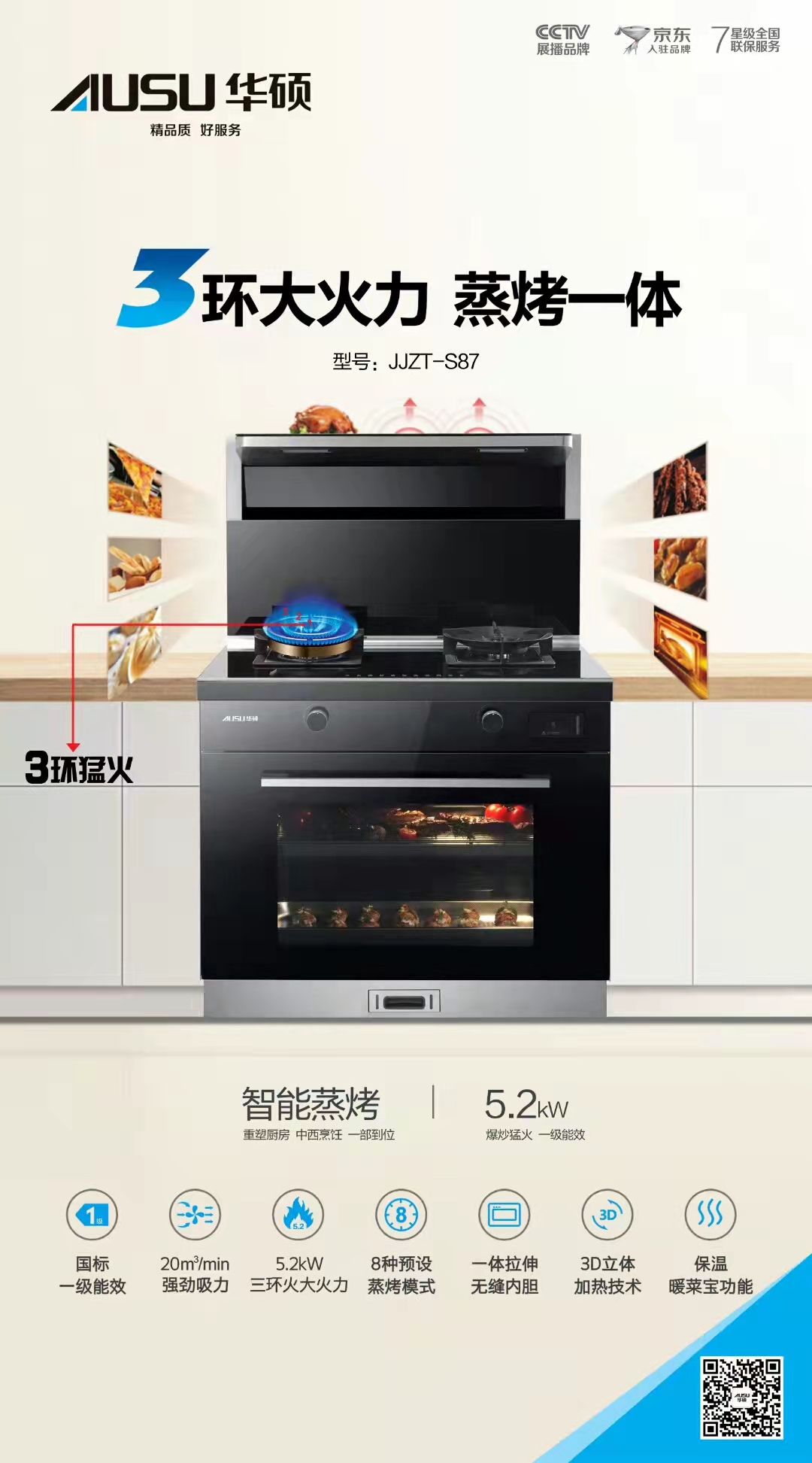 2.烟灶、蒸烤一体式开关,操作简便,无需俯身操作。