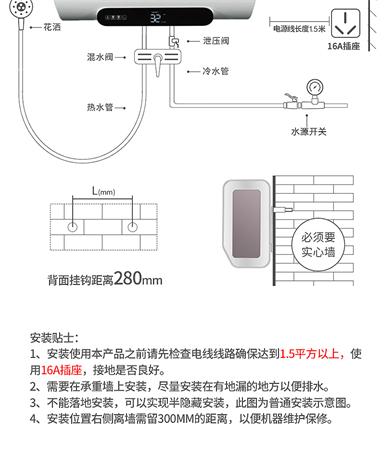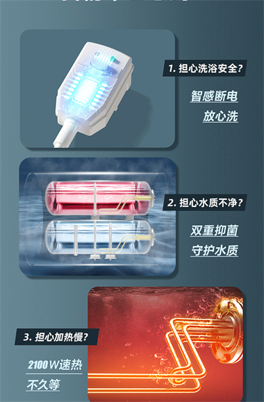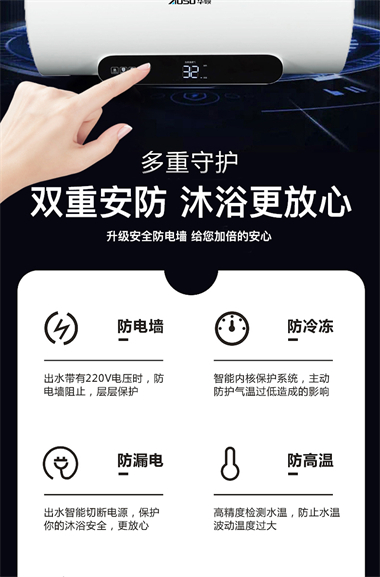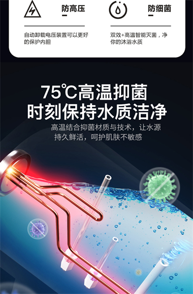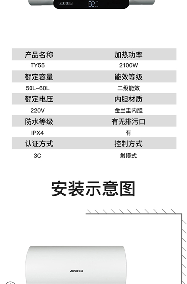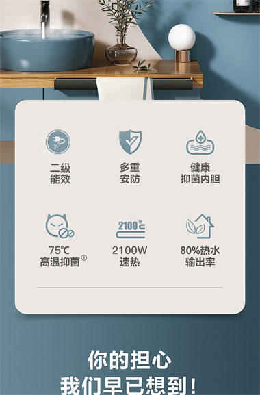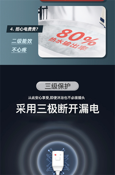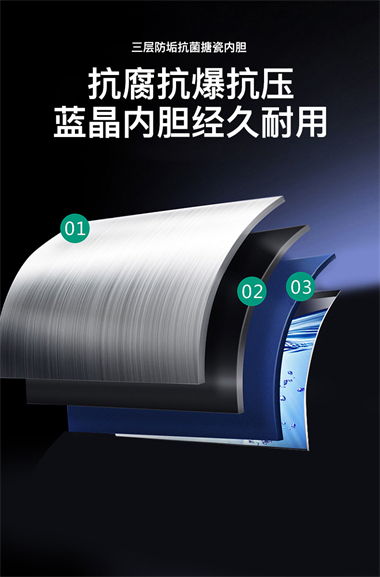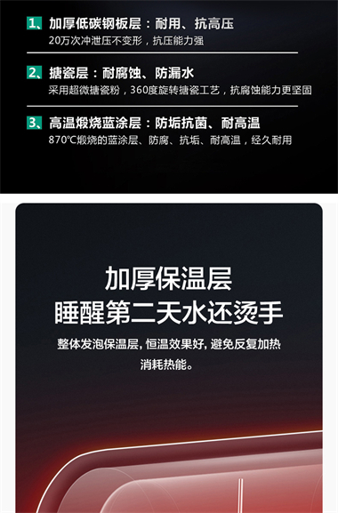 1、整体聚酯发泡,减少热损失,节能环保; 2、优质合金兰圭内胆,环保节能,抗腐耐用寿命长; 3、大功率下潜式加热技术,速热又增容(减少冷水死角 4、超大数字显示机械式旋钮设计,操控简便、一目了然 5、金属外壳,亚光白喷涂处理,国际流行外观设计,外观新颖; 6、采用三极断开漏电保护系统,特设超压保护、防干烧保护、超温保护等多重安全保护